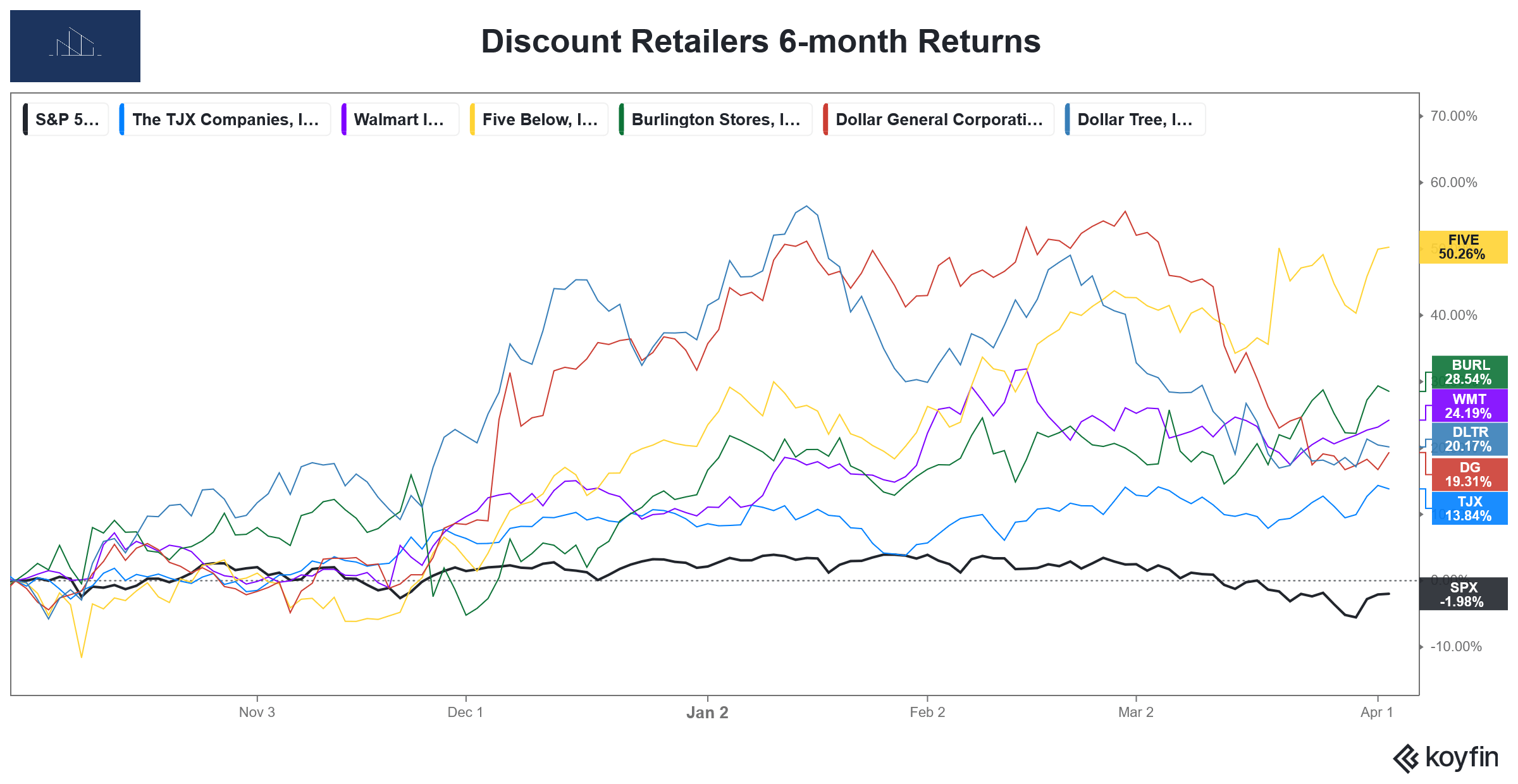Trading Down: When discount stores outperform, it means families are swapping name brands for generics to make ends meet. This is often the result of their budgets getting squeezed by a weaker economy, higher inflation, and/or rising debt servicing costs.