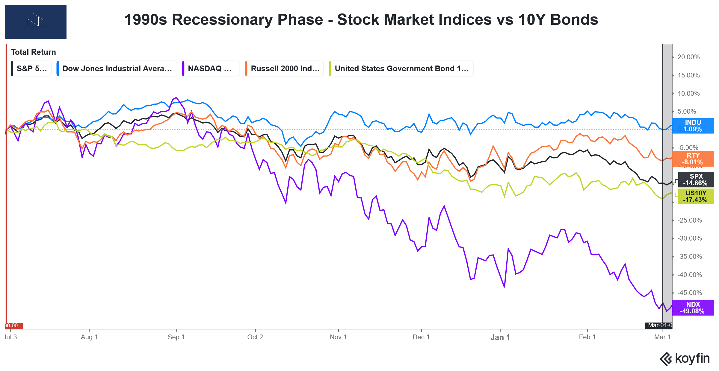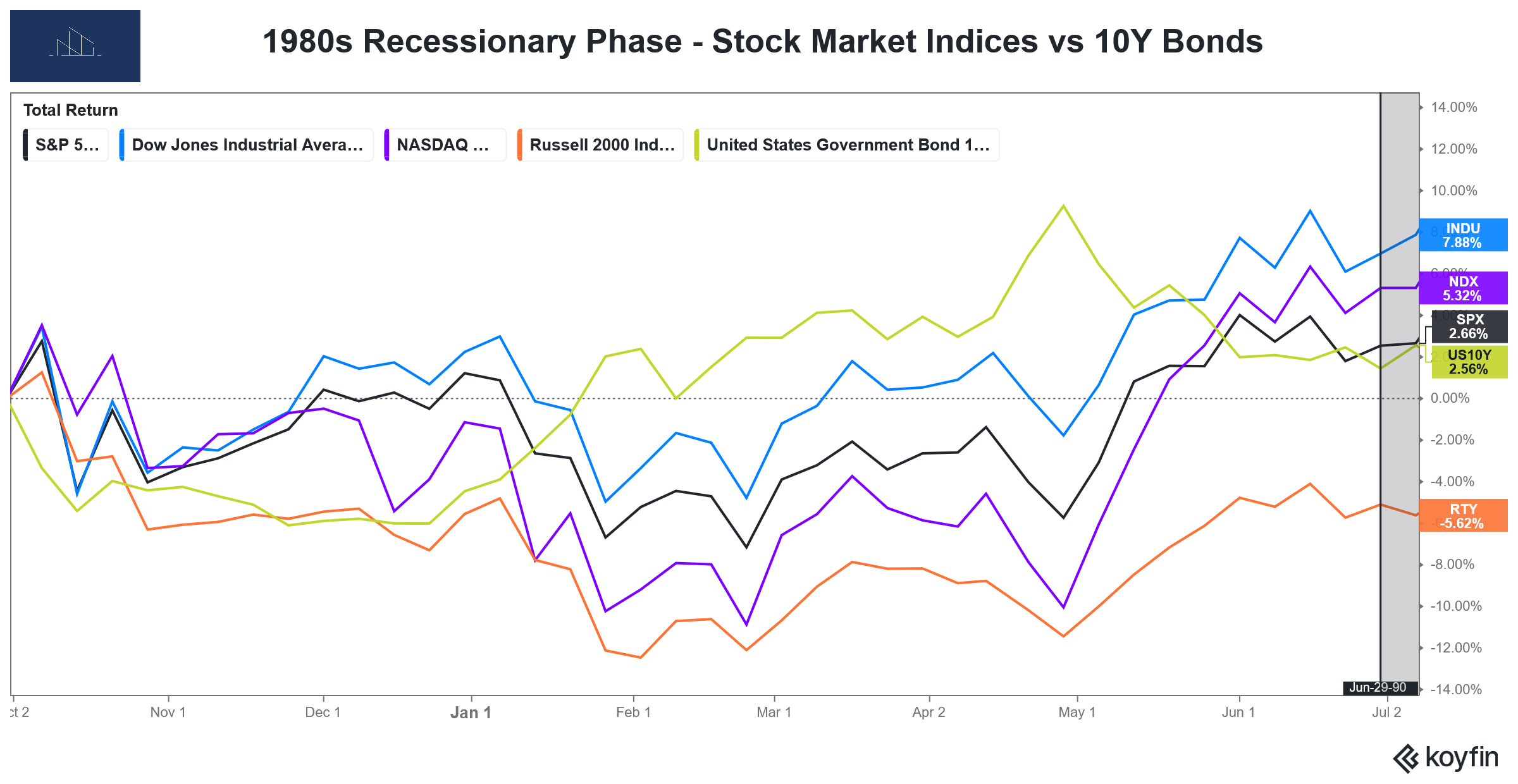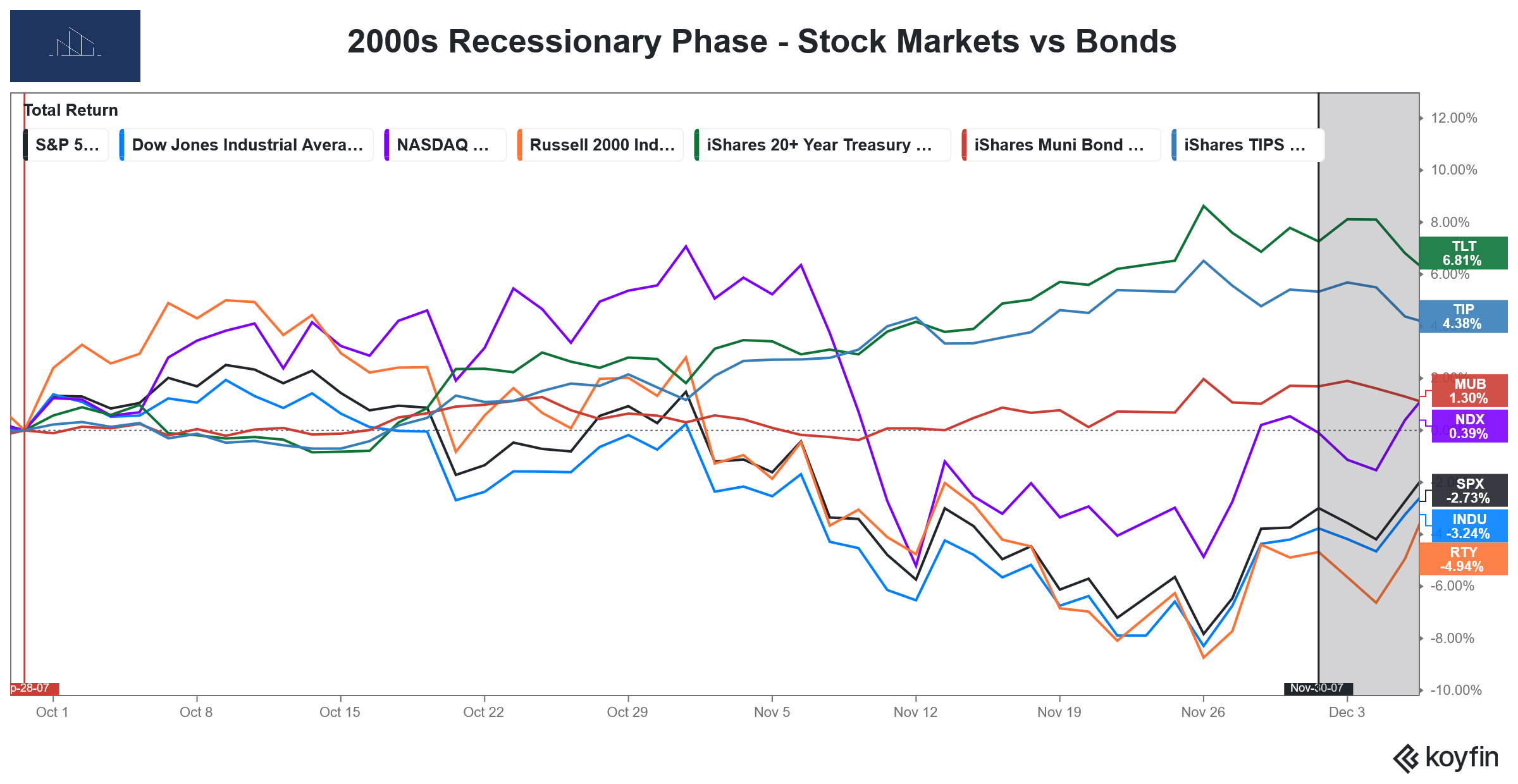 Here’s a look back at how stocks and bonds performed the last four credit cycles until the beginning of the official recession.