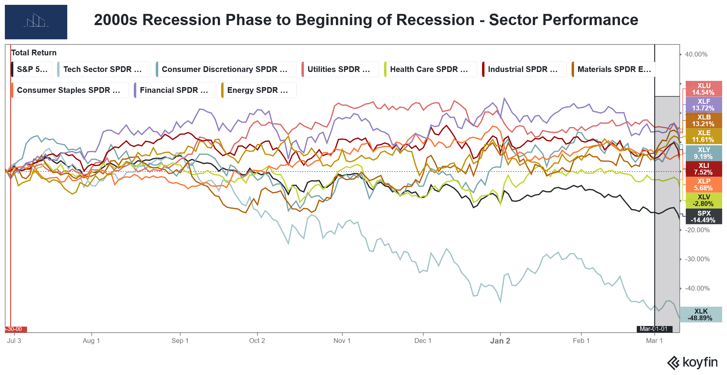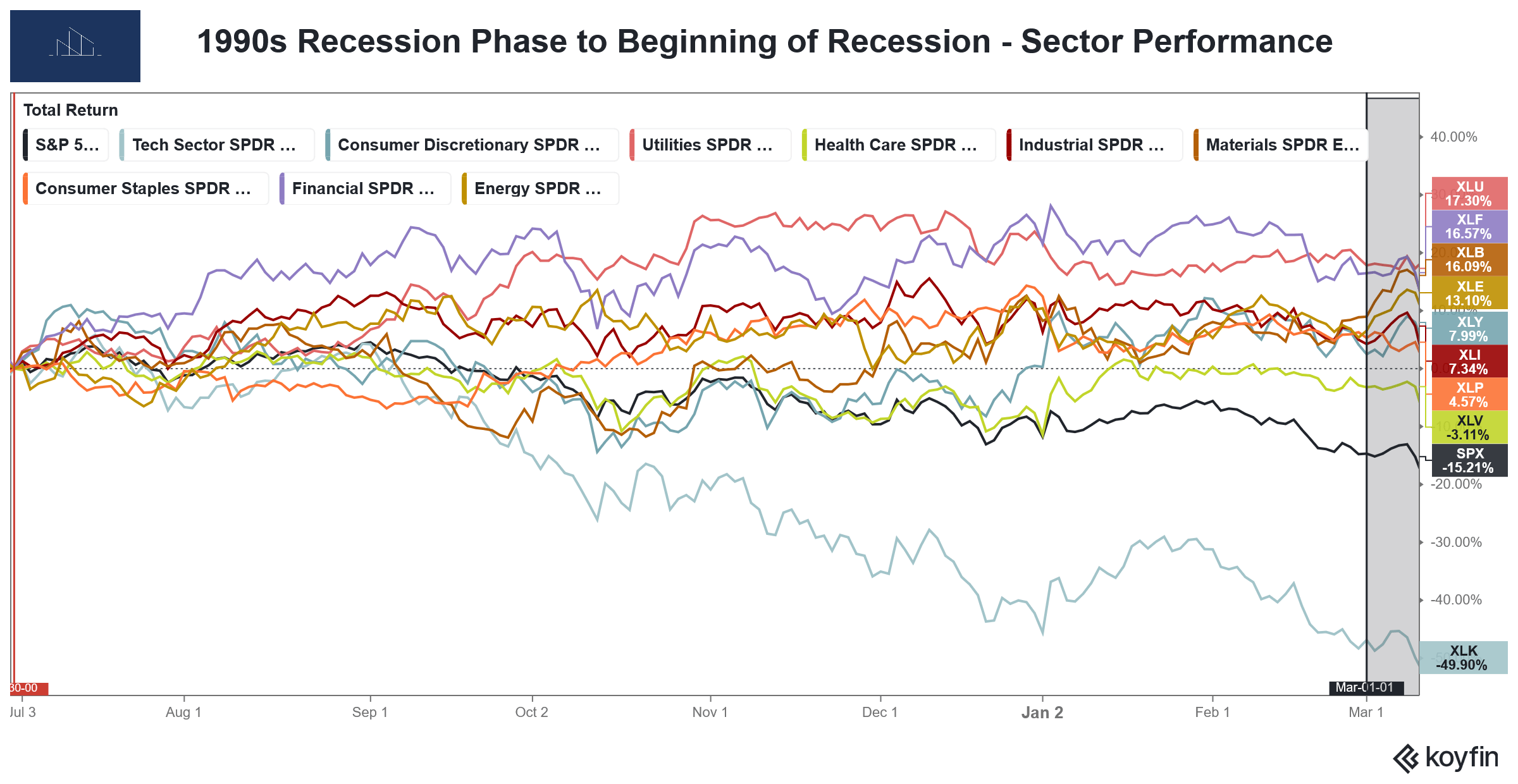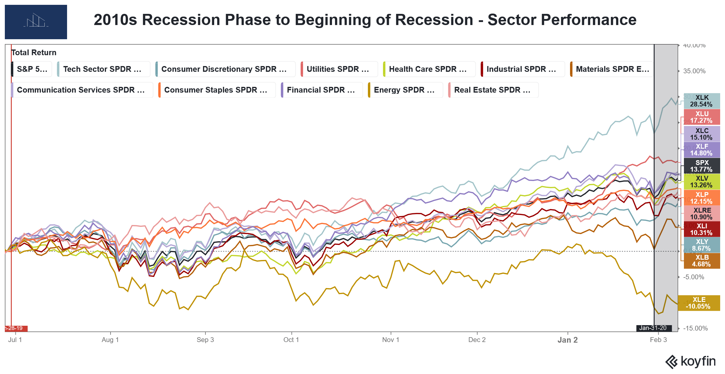And below are the sector performances from the past three credit cycles when The Economy Tracker went into Recession phase until the official start of the recession.