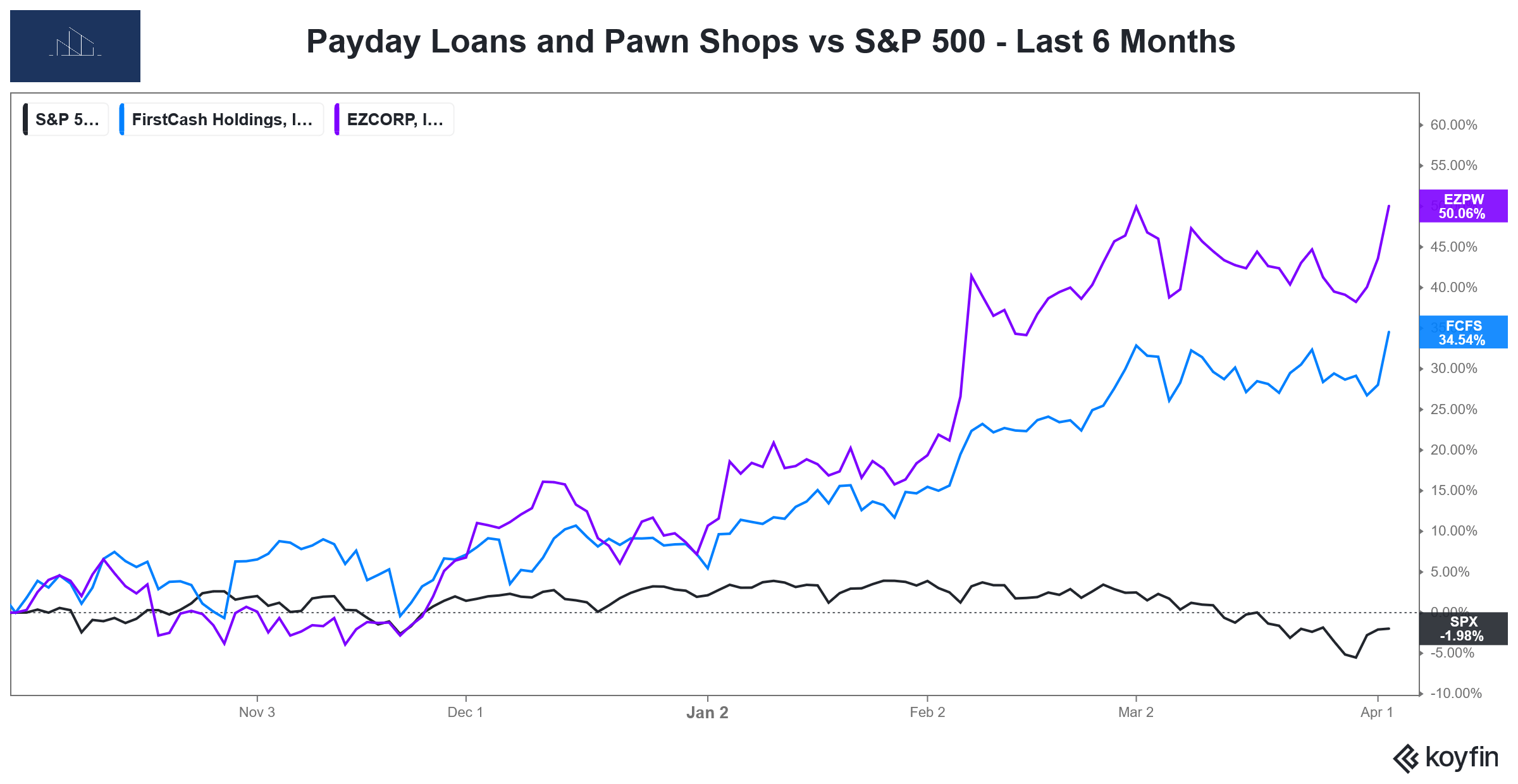 Beyond the stock market, real-world data shows that household budgets are being squeezed. We are seeing "relative strength" in businesses that thrive when people are struggling: Discount Retailers, Pawn Shops, and Payday Lenders.